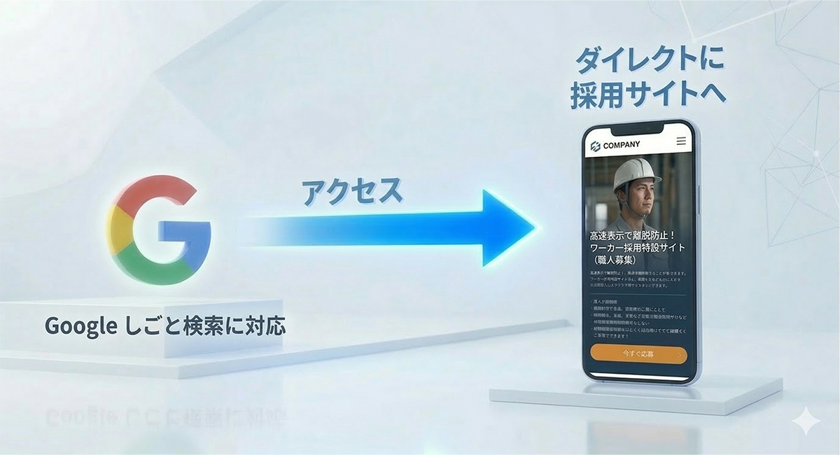 地域名や職種で検索している「今すぐ働きたい人」を、大手の求人サイトを通さず、ダイレクトに御社の採用サイトへ呼び込みます。